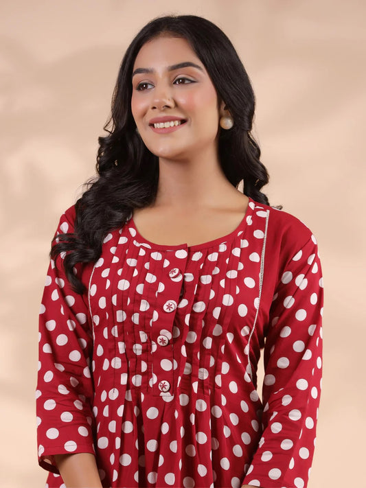 [ Ready SG Stock ] Red Polka Dot A-Line Cotton Kurta With Pant 2 Pcs Punjabi Suit [Indian Smart Casual Wear]