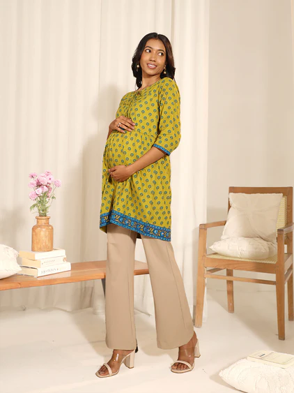 [Ready SG Stock] Women's Maternity-Wear Green Cotton Printed A-Line Top \Tunic \ Blouse - Indian Dresses