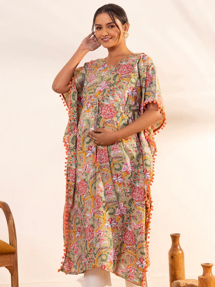 [Ready SG Stock] Women's Maternity-Wear Beige Cotton Printed Kaftan Dress, Only Top