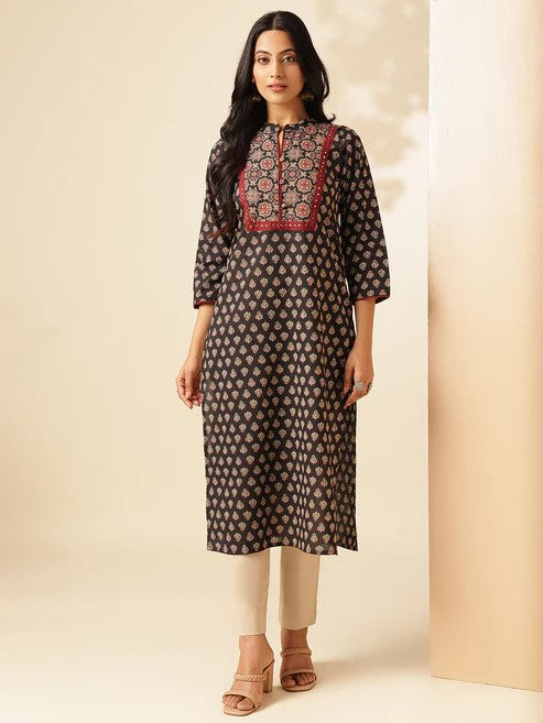 [Ready SG Stock] Black Floral Printed Straight Cut Cotton Punjabi Kurta \ Only Top [Indian Casual Dresses]