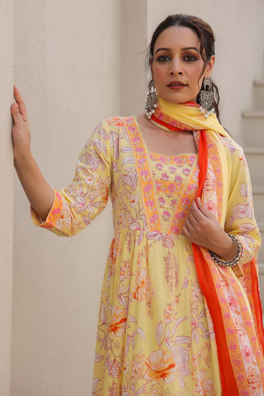 [Ready SG Stock] Yellow Floral Pure Cotton Alia Style Anarkali Punjabi Suit with Dupatta 3 Pcs Set [ Indian Dresses ]
