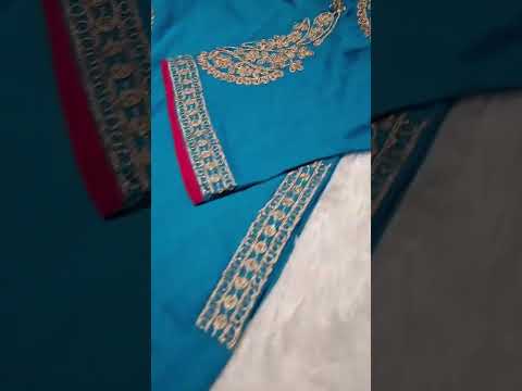 Elegant V Neck Jari Thread Embellished Embroidery On Front & Sleeves & Bottom of Kurti \ Top & Potli Bag. Pant is Solid Rayon with Elasticated Waisband.