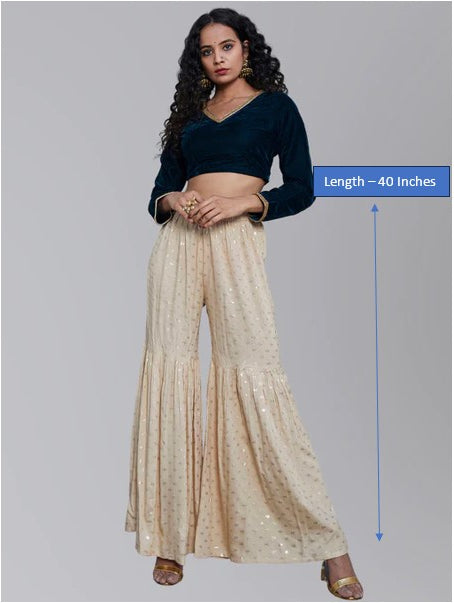 A timeless festive cream color & Black Colour flared sharara. Tailored with tiers, the pants feature gold foil print all over which gives it an attractive look. Pair it with a crop top or with a short kurta.