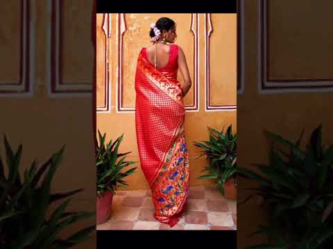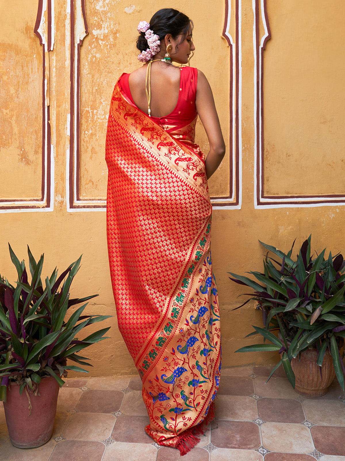 - Elevate your style with this exquisite saree in Red Paithani silk. Its stunning design features intricate Woven ethnic motifs which exuding an elegance. Pair it with classic earrings and two shades for a truly classy look.